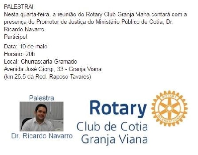 Hoje (10/05), às 20h, Ricardo Navarro, Promotpr de Justiça do Ministério Público de Cotia, fará uma palestra no evento do Rotary Club Granja Viana.