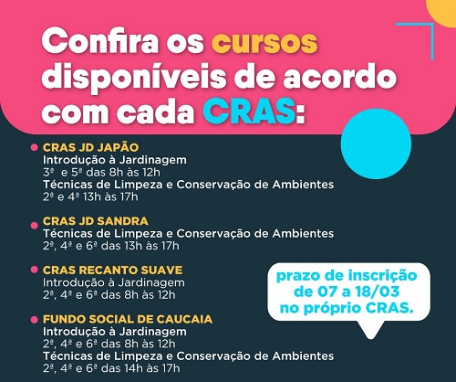 A Secretaria de Desenvolvimento Social prorrogou até o dia 18 de março o prazo de inscrições nos cursos profissionalizantes gratuitos do Senac. As aulas serão presenciais respeitando os protocolos sanitários de proteção à Covid-19 e à Gripe, as vagas são limitadas e as inscrições devem ser feitas nos Centro de Referência de Assistência Social (CRAS) [veja abaixo].