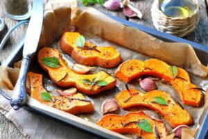 3. Coloque as fatias de abóbora na forma e asse na grade do meio por cerca de 30 minutos;