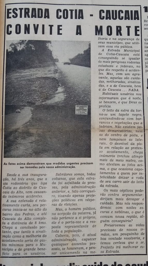 “A Estrada Municipal de Cotia-Caucaia está conseguindo se igualar às perigosas rodovias estaduais e federais, no que se diz a acidentes”, citava a matéria.