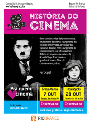 O Colégio Rio Branco oferece no dia 7 de outubro, sábado, na Unidade Granja Vianna,  das 10h às 14h, o workshop gratuito e aberto ao público “História do Cinema”, ministrado pelo renomado especialista na área, Franthiesco Ballerini.
