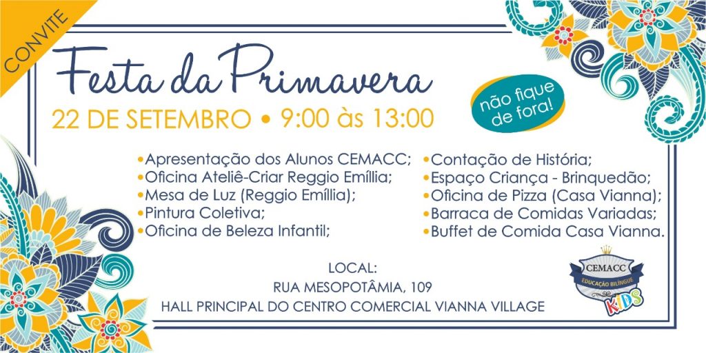 A escola de educação infantil Cemacc, em parceria com o Vianna Village, realizará a festa da primavera.