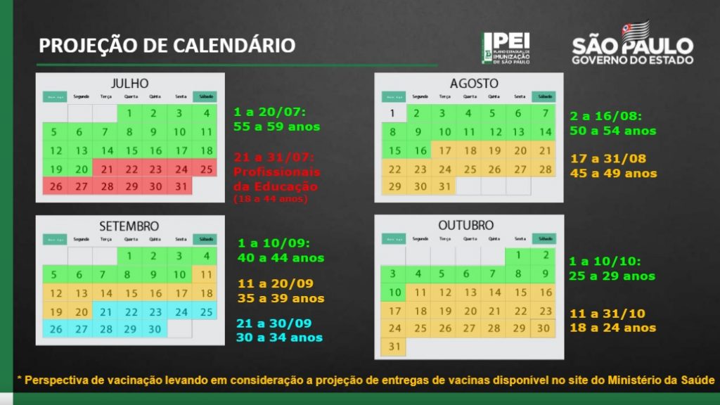 A nova data antecipa em dois meses o prazo inicialmente previsto pelo Governo de São Paulo para concluir a campanha. A projeção foi calculada pelo PEI (Plano Estadual de Imunização) com base nas perspectivas de disponibilidade de vacinas informada publicamente no site do Ministério da Saúde e considera o início do esquema vacinal, que é composto por duas doses conforme as bulas dos imunizantes disponíveis no Brasil.
