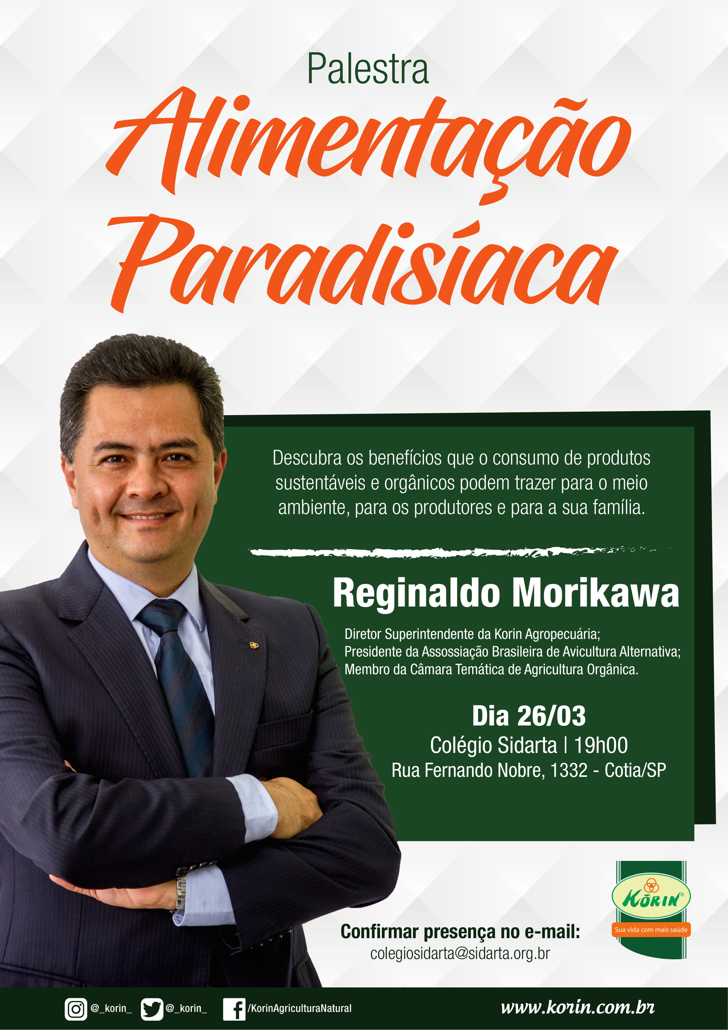 No dia 26 de março, às 19h, Reginaldo Morikawa, diretor da Korin Agropecuária, presidente da Associação Brasileira de Avicultura Alternativa e membro da Câmara Temática de Agricultura Orgânica realiza a palestra Alimentação Paradisíaca no Colégio Sidarta.