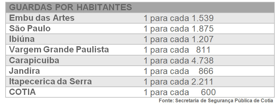 Entre as ações a serem implementadas pela Secretaria de Segurança para 2019 está o aumento do efetivo da Guarda Municipal em pelo menos mais 100 agentes. Atualmente são 386. A cidade possui uma média de um Guarda Civil para cada grupo de 600 habitantes, o que a coloca em um patamar alto quando comparada com outras grandes cidades (veja tabela). “A presença de guardas na rua limita a ação de bandidos”, reforça Almir Rodrigues.