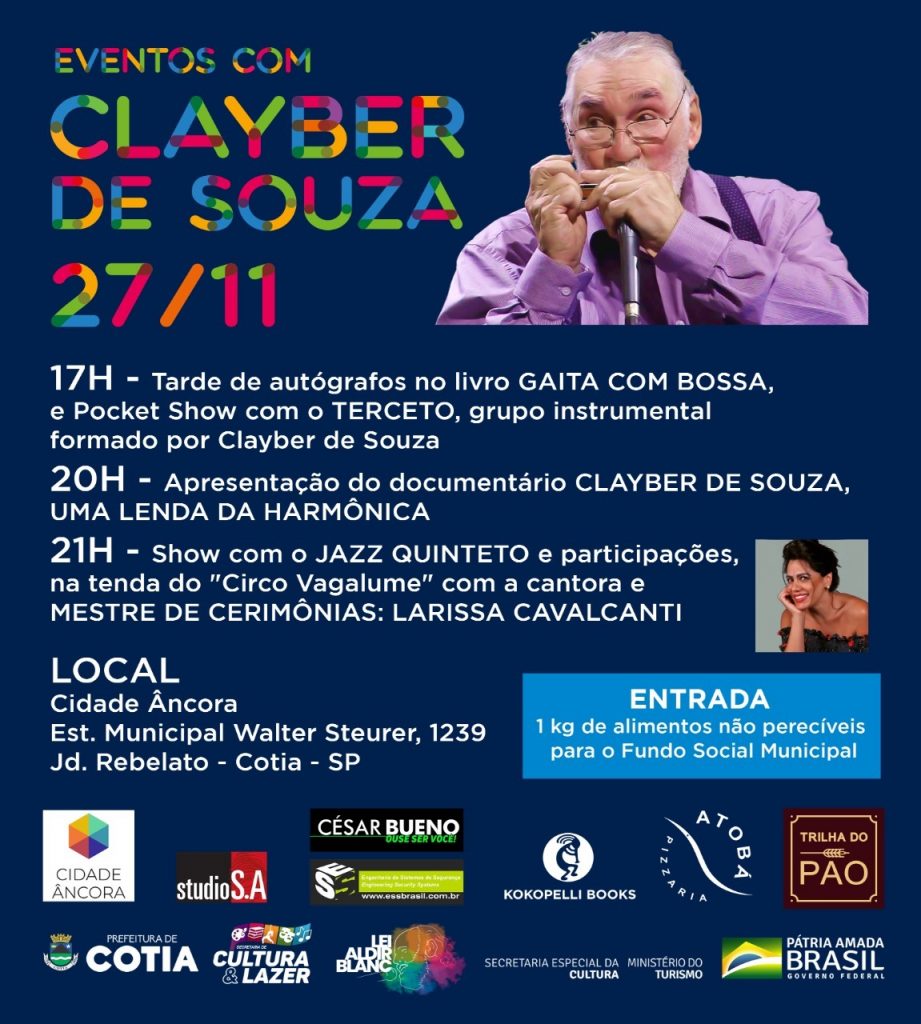 Neste sábado (27), a tenda circense da “Cidade Âncora”, em Cotia, será o palco de uma tarde de homenagens a Clayber de Souza, músico, harmonicista e professor reconhecido internacionalmente e diplomado pela Academia Brasileira de Arte e Cultura por seu método didático de Gaita de Boca. E toda a homenagem ainda é pouco para quem executa 40 tipos diferentes de harmônicas e, em arranjos especiais, pode executar até seis instrumentos simultaneamente. O mestre das gaitas, foi eleito um dos 10 melhores harmonicista do mundo pela fábrica de gaitas alemã Hohner e no Brasil o melhor pela fábrica de Instrumentos “Hering”. Tem mais 62 discos e CD’s gravados e tocou ao lado de Oscar Peterson, Billy Eckstein, Flora Purin, Hermeto Paschoal, Airto Moreira, César Camargo Mariano. E não acaba por aí: integrou o grupo Sambossa-5 e os trios “Sambalanço”, “Sambrasa” e “Jongo. É o currículo de quem faz da música sua arte.