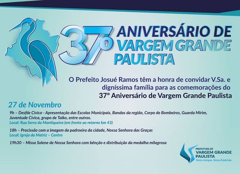 No próximo dia 27 de novembro, a cidade de Vargem Grande Paulista comemora o seu 37º aniversário com comemorações cívicas e religiosas.