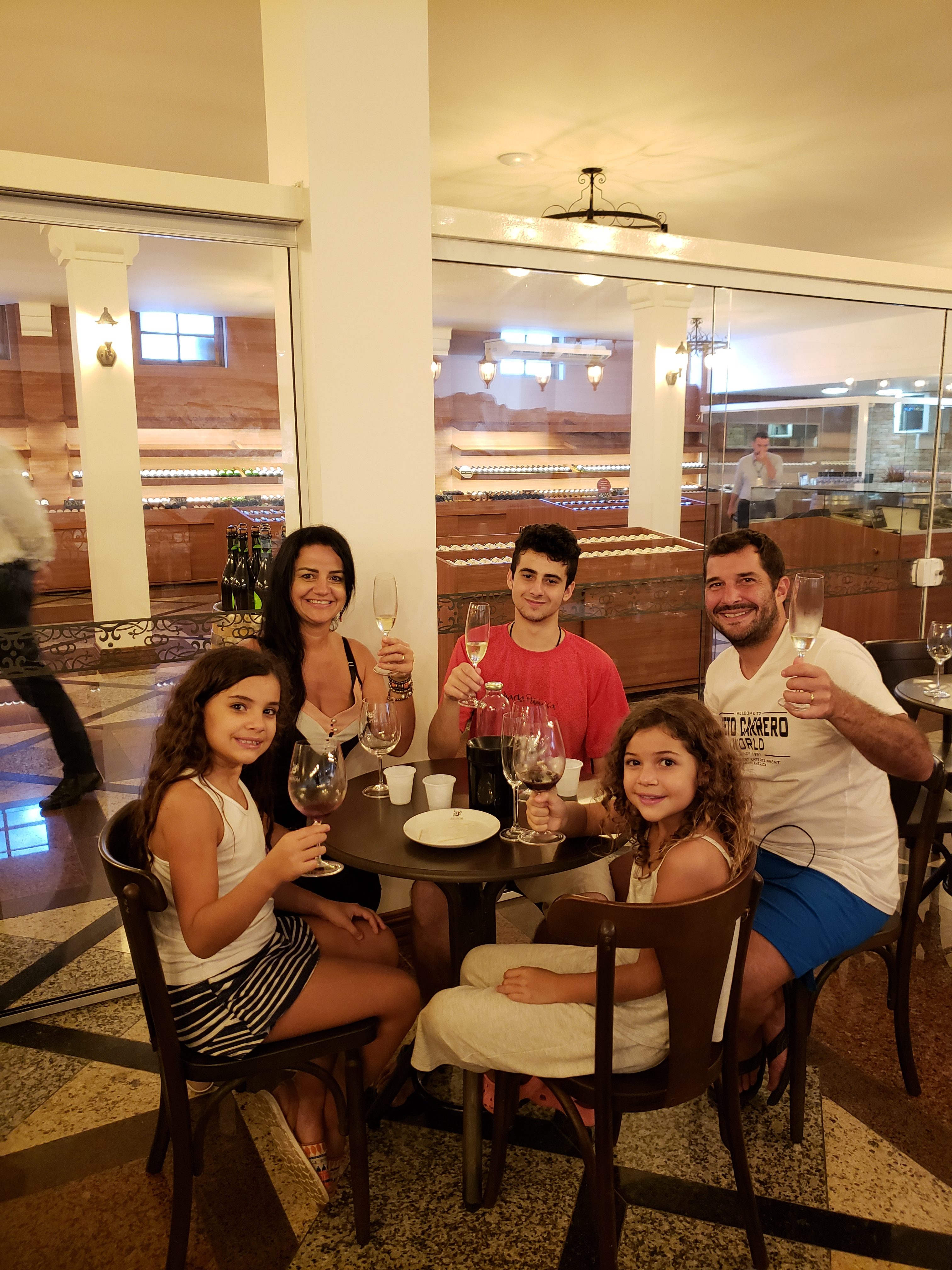 Sim, temos três aparelhos de ar-condicionado e até adega de vinho. Cada uma das meninas tem o quartinho dela, o Lucas fica na sala que é um sofá-cama e no fundo do motorhome ainda tem o quarto do casal. Tudo separado por portas, com chuveiro e privacidade. São 42 m2 de área. Muita gente que entrou aqui fala que é maior do que o apartamento em que vive.